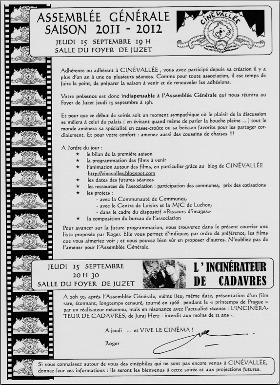 Convocation à l’AG Assemblée Générale Cinévallée 15 Septembre 2011 à 19h septembre 8, 2011 Publié dans L'association, Non classé